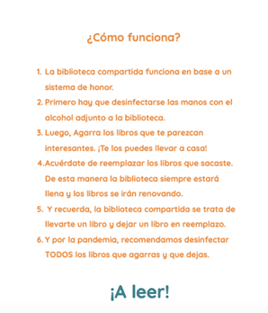 “Ignacio y yo decidimos crear una biblioteca portátil interactiva y completamente gratuita donde las personas pudieran obtener libros con fines educativos, pero también para actividades recreativas. No solo esto, sino que debido a que muchos han perdido el contacto humano y ya no pueden interactuar con sus comunidades, nuestra biblioteca compartida es una excelente manera de reconectarse con las personas y aprovechar esa identidad comunitaria que todos extrañamos”.